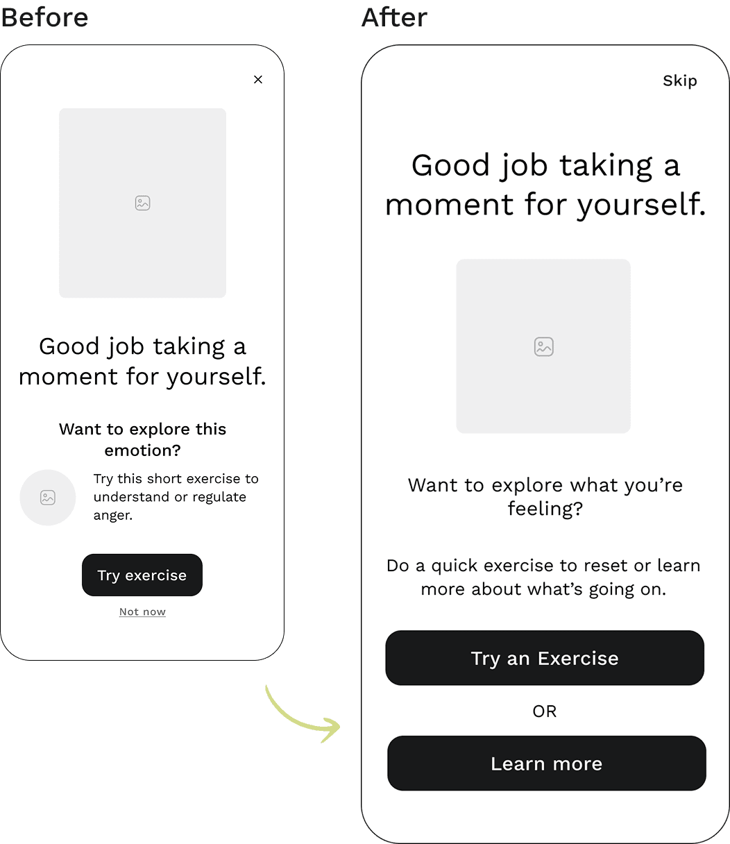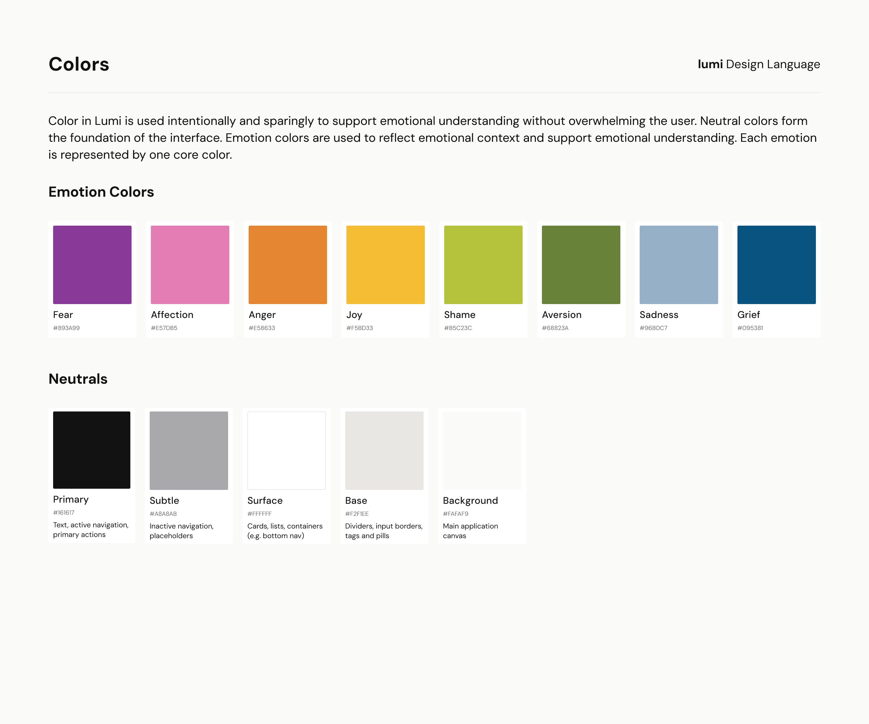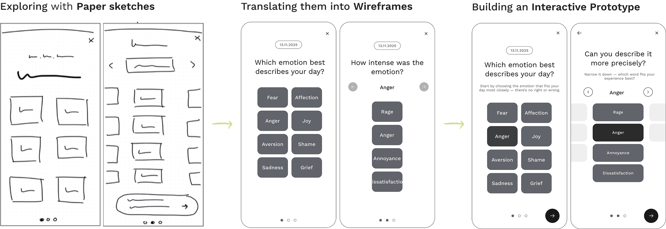The research also challenged my assumptions. I'd expected most people would struggle to name emotions, but emotional literacy varies widely—and both beginners and experienced users shared the same core need for frictionless tools that deliver real insight. Exploring how one design could serve both groups shaped key decisions like the two-step emotion identification flow and emotion-linked navigation.