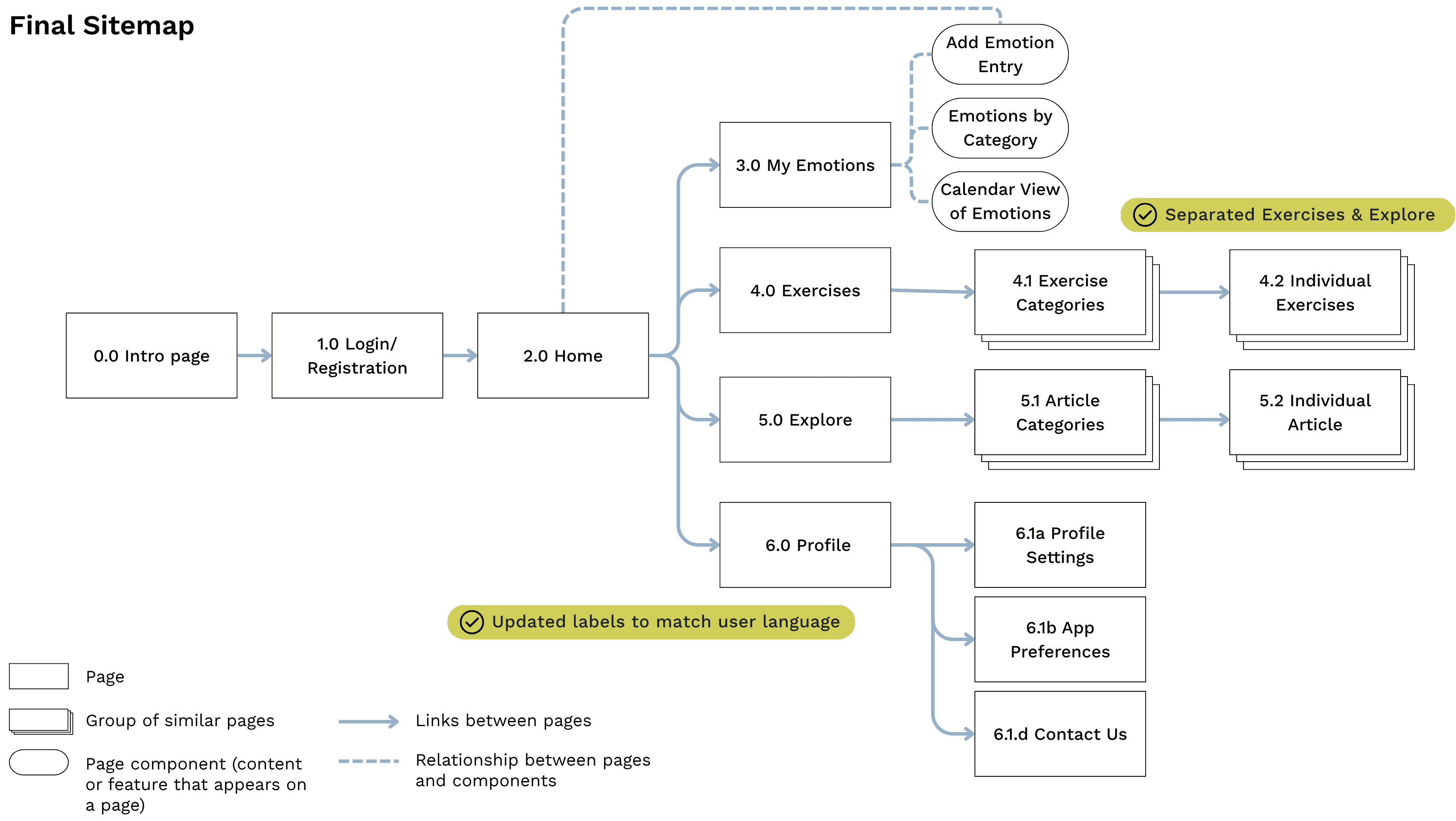 I translated the flows into a sitemap and validated it through two rounds of card sorting. Key outcomes: separating Exercises from Articles, and choosing more approachable labels—like "Explore" for articles and "My Emotions" for insights and patterns.