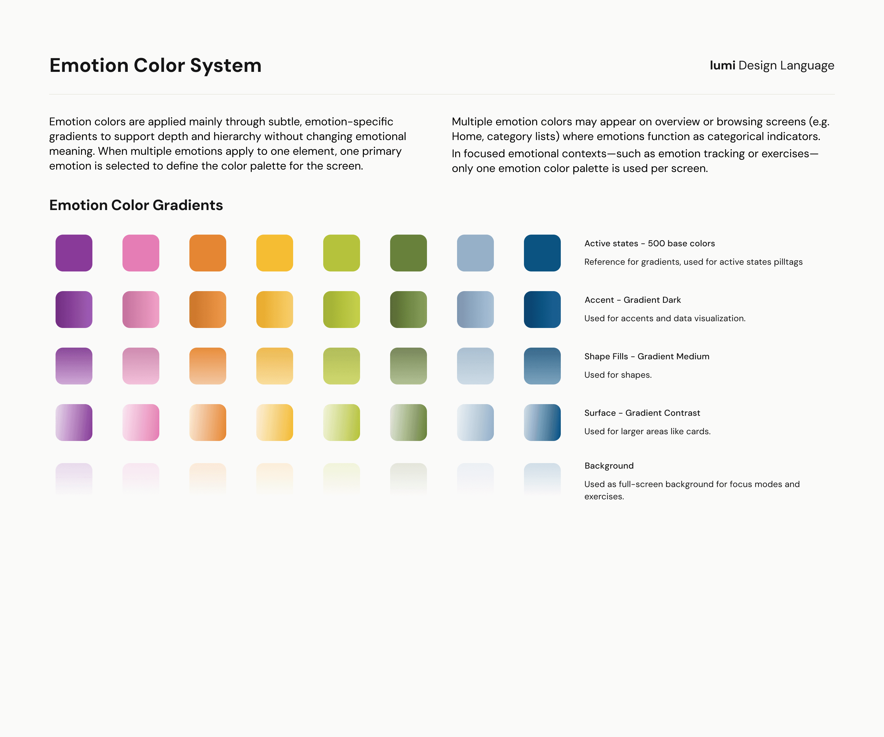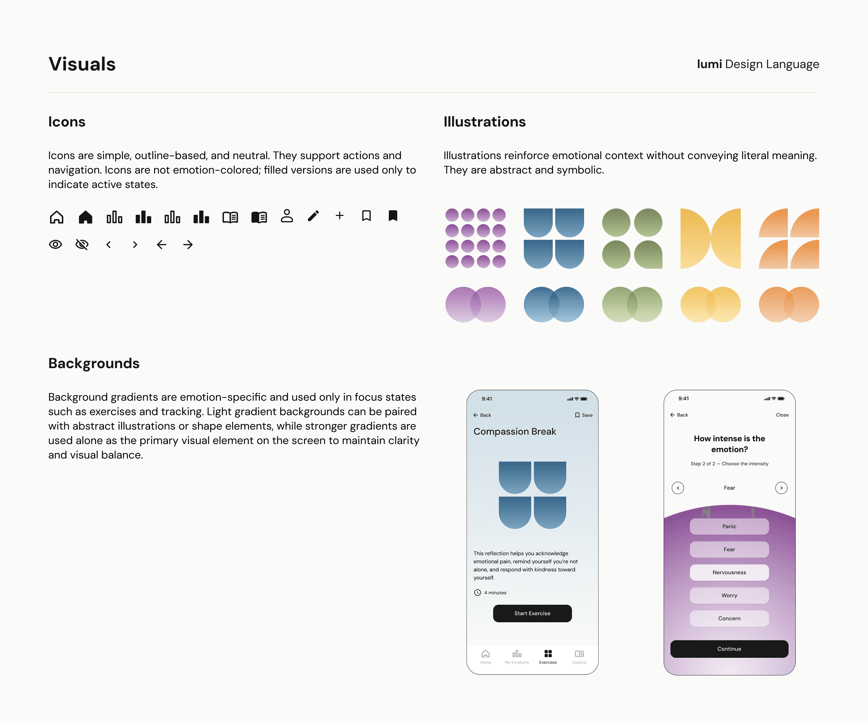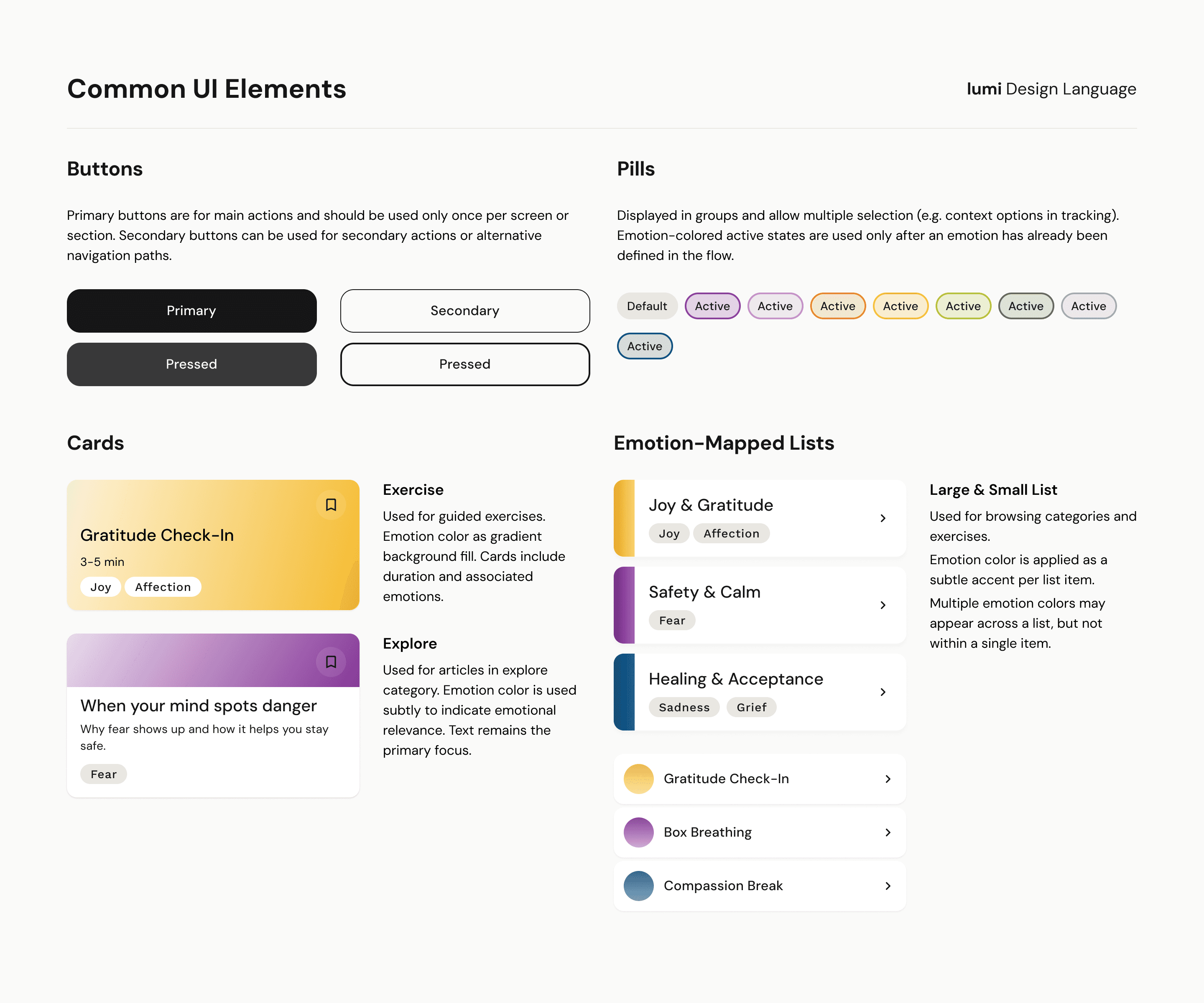 Lumi's core features—emotion tracking, My Emotions, and emotion-linked exercises and articles—work as one connected system. A consistent visual language helps users move between features without re-orienting, reinforcing emotional continuity rather than breaking it.