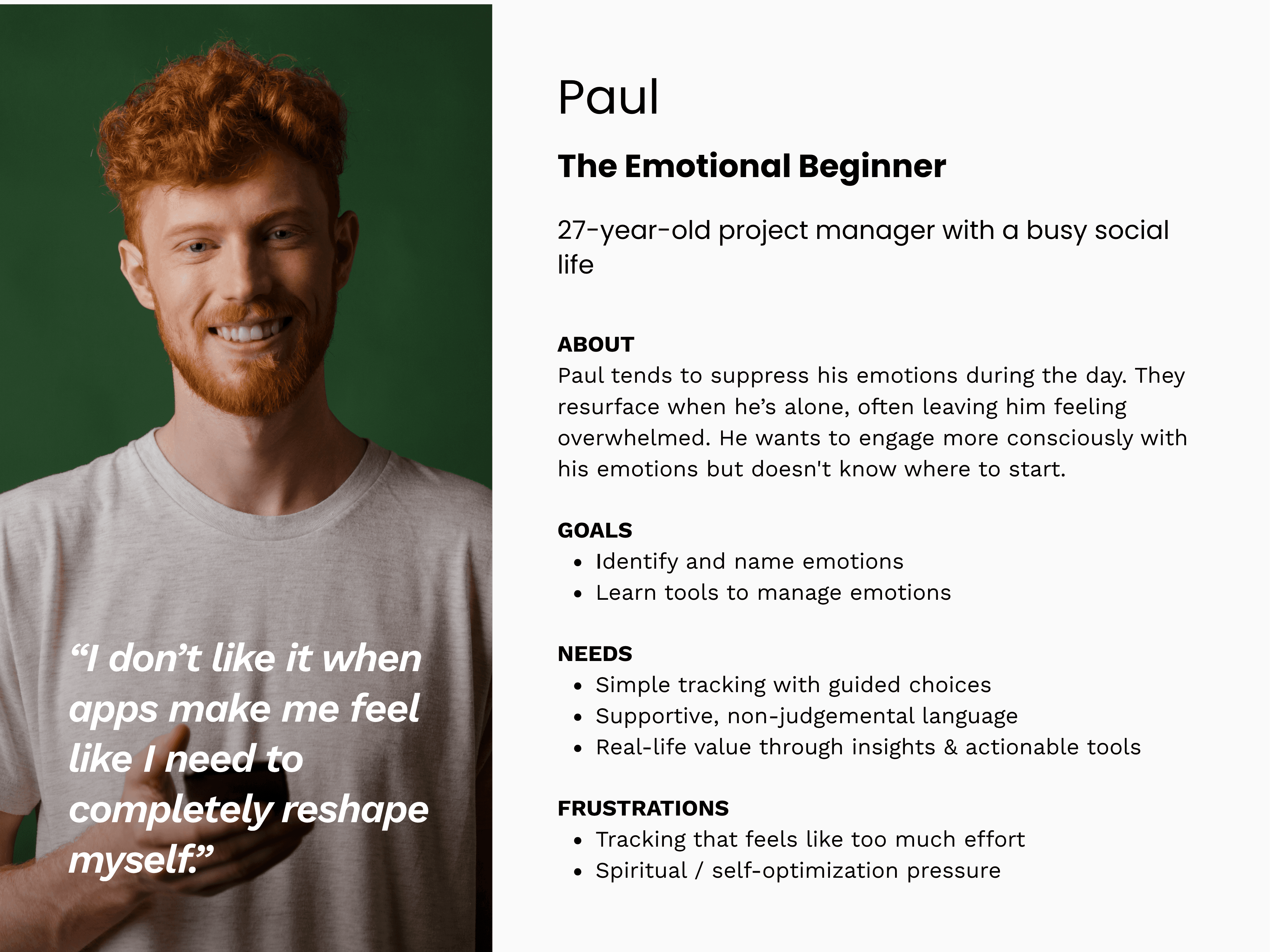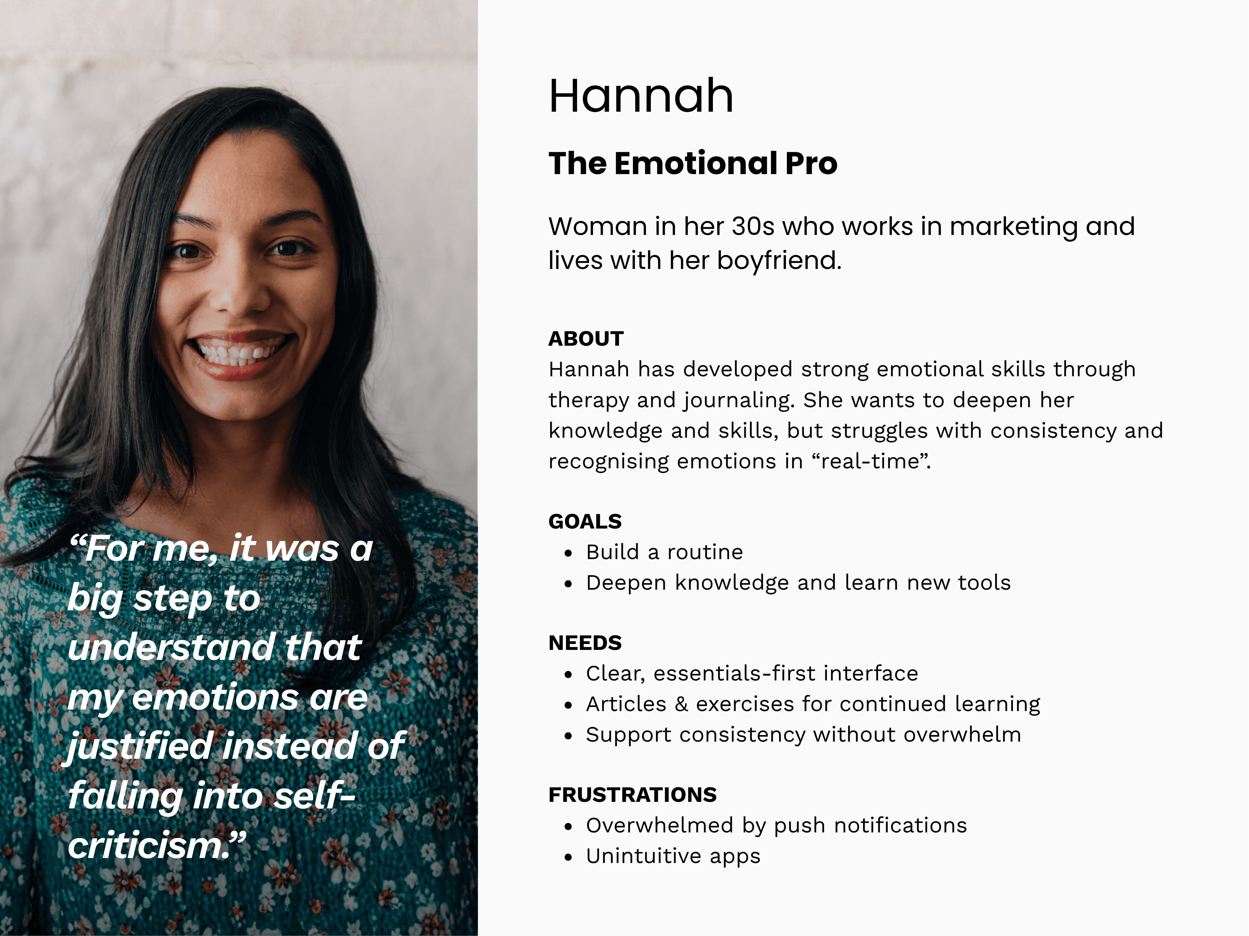 The biggest surprise: emotional literacy varies widely. Some struggle to name emotions beyond "good" or "bad," while others are emotionally skilled but want support building consistency and deepening their practice. Using affinity and empathy mapping, I translated these insights into two personas representing these distinct patterns. Both personas use the same core features — but with different priorities and motivations.