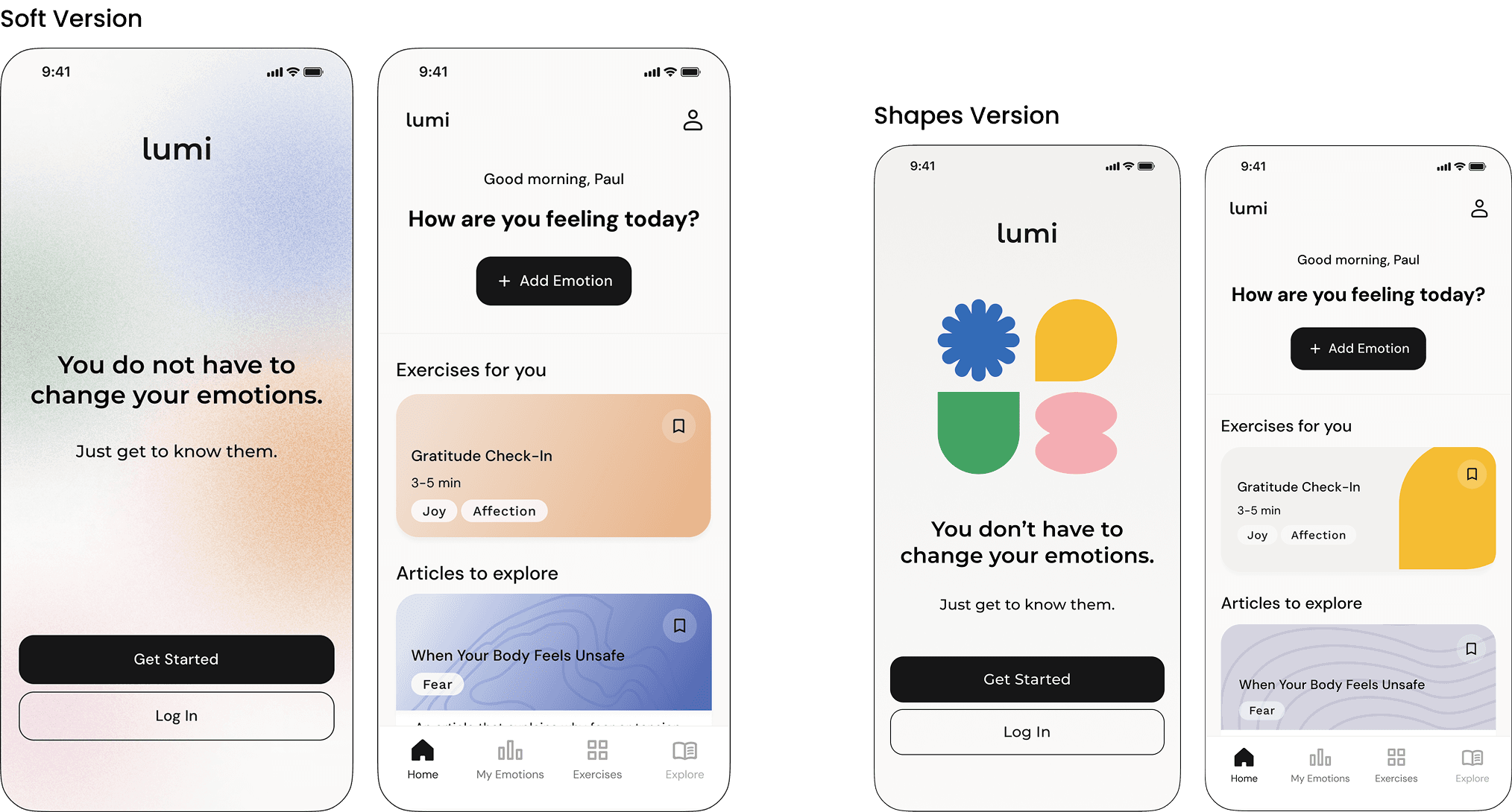 After validating Lumi's core flows with a grayscale prototype, I wanted to ensure the visual design supported emotional clarity without adding overwhelm. I ran a preference test comparing two approaches. Most participants preferred the Soft direction, describing it as calmer and more approachable—so it became the foundation for the final UI.