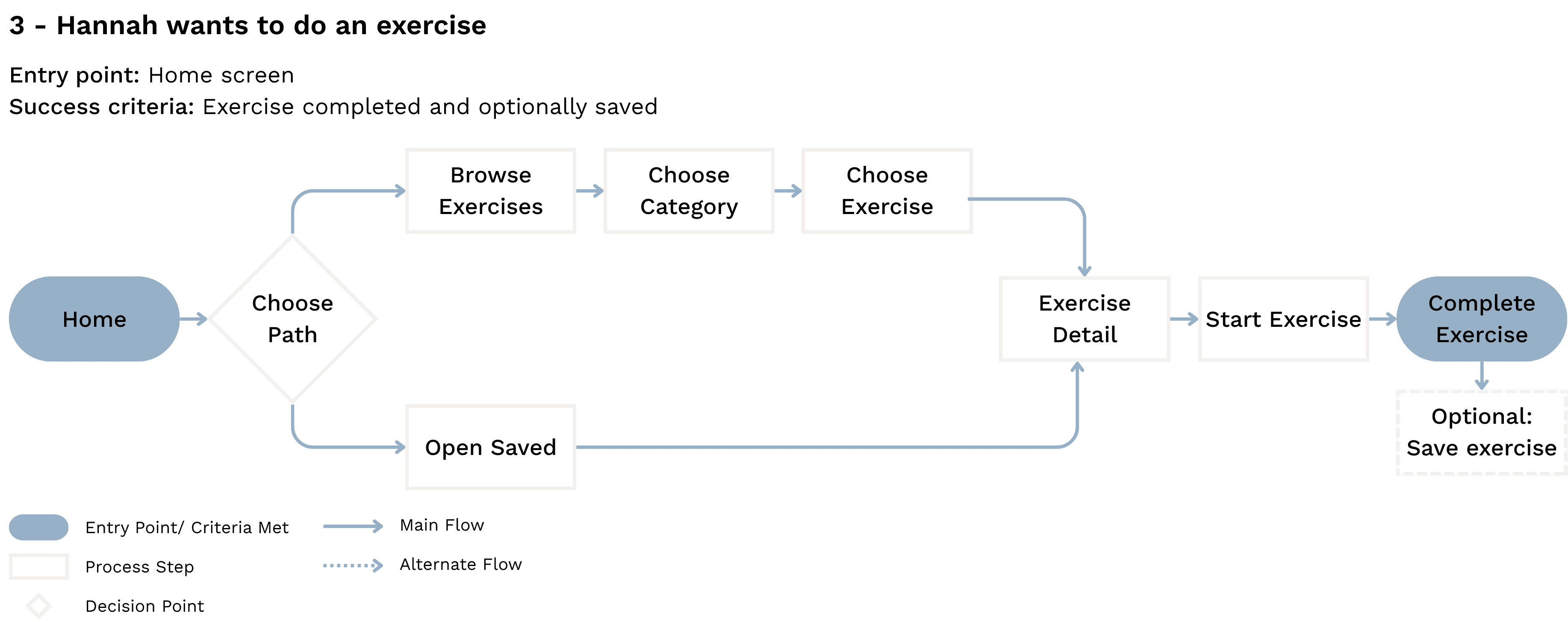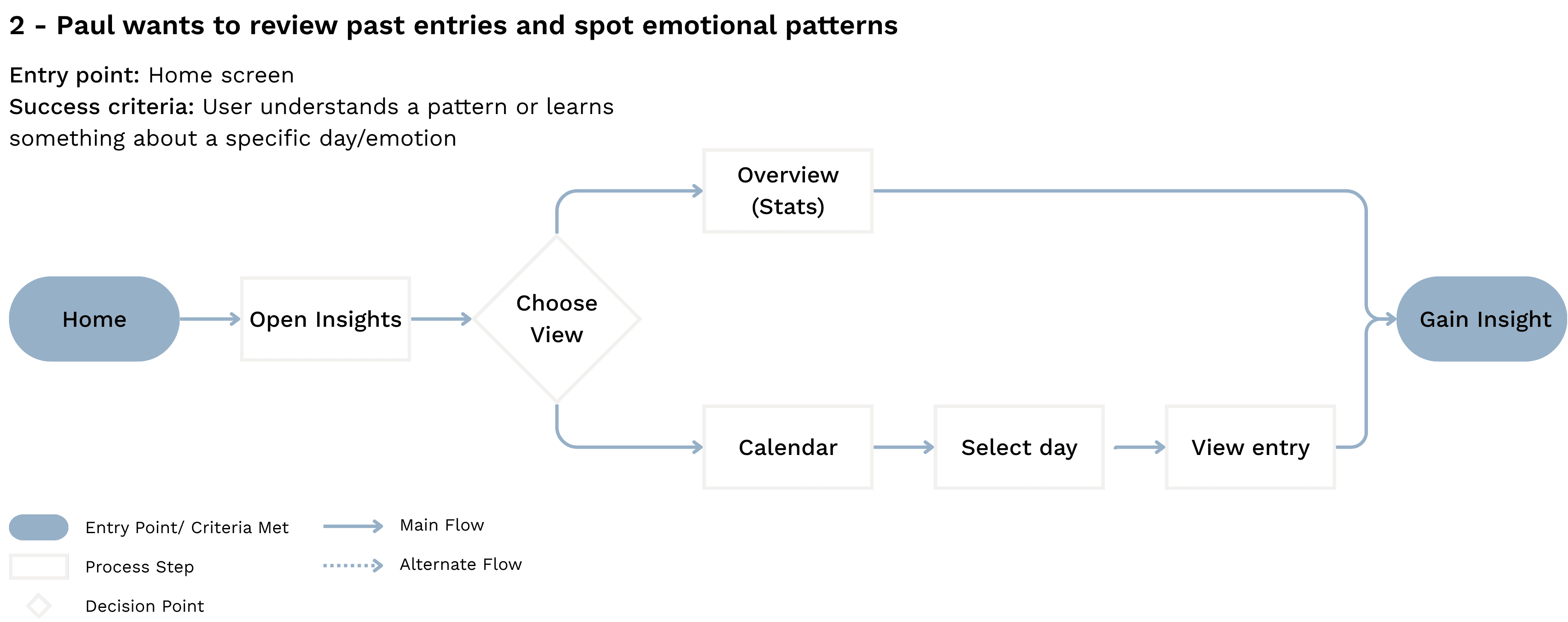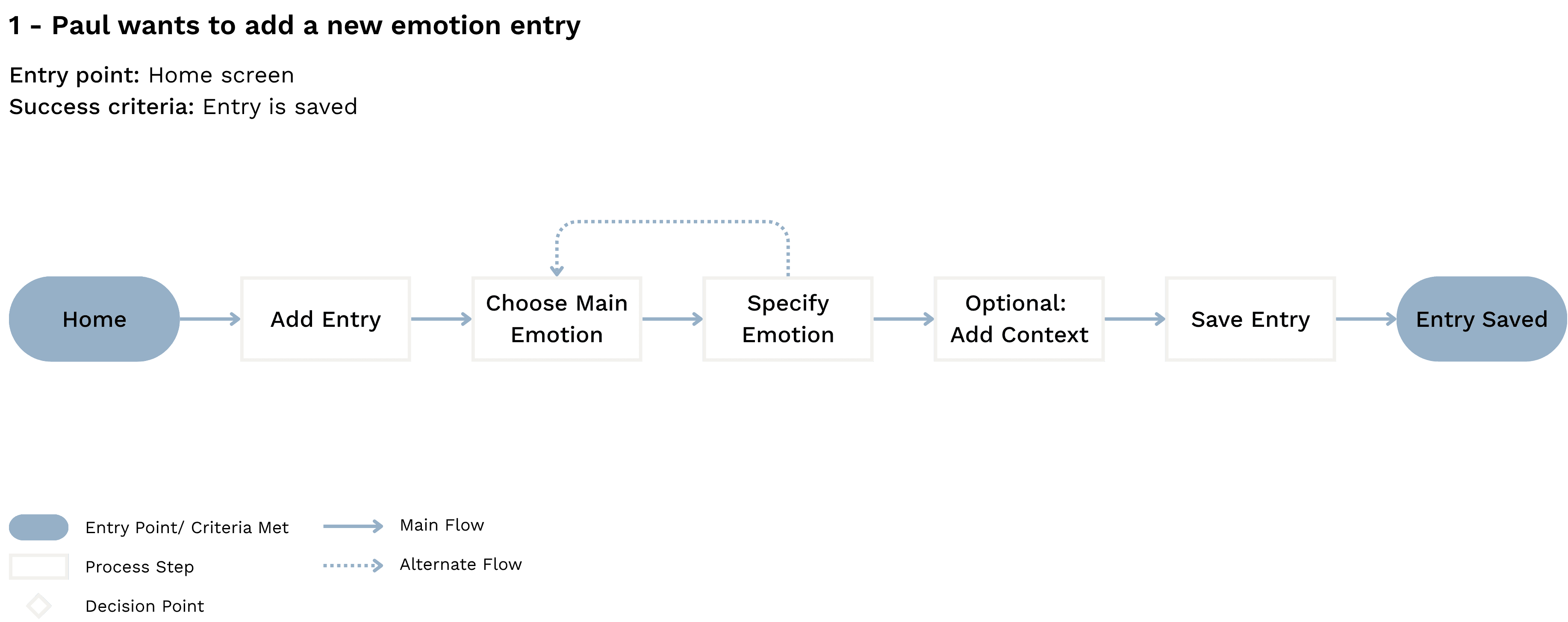 Based on the personas and research, I identified three core tasks and mapped them as user flows: add an emotion entry, view insights, and do an exercise or read an article.