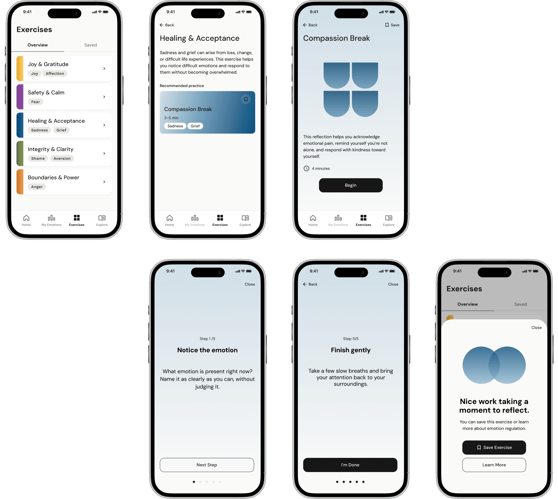 Exercises are organized into needs-based categories and mapped to emotions so users can quickly find relevant support. Clear previews reduce uncertainty, and saved exercises make it easy to return to what worked.