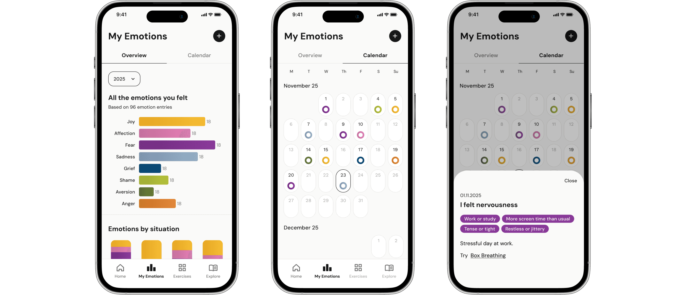 My Emotions turns daily tracking into practical insight. Users spot patterns through an overview of emotions, triggers, and body sensations or switch to the calendar to revisit specific entries.