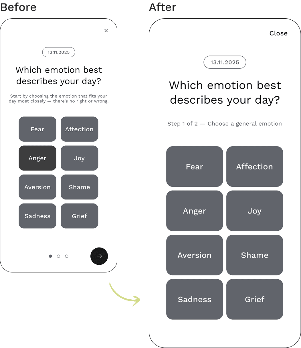 The emotion entry flow became the foundation—it enables both pattern recognition and emotion-linked support. I designed a two-step tracking approach that guides users from general emotions to more specific ones, with optional context to support meaningful insights over time.